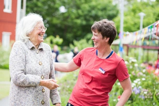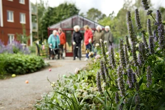 I direkt anslutning till boendet finns en trädgård som är utformad för att locka till utevistelse, social samvaro och aktivitet. Här finns sinnesstimulerande planteringar och mysiga uteplatser med rum för måltider och och andra trevligheter. Det finns en kryddodling för doft och smak och många av växterna drar till sig fjärilar, humlor och bin. Vi har en centralt placerad grillplats i trädgården och en vacker fontän som skapar naturliga sociala mötesplatser.